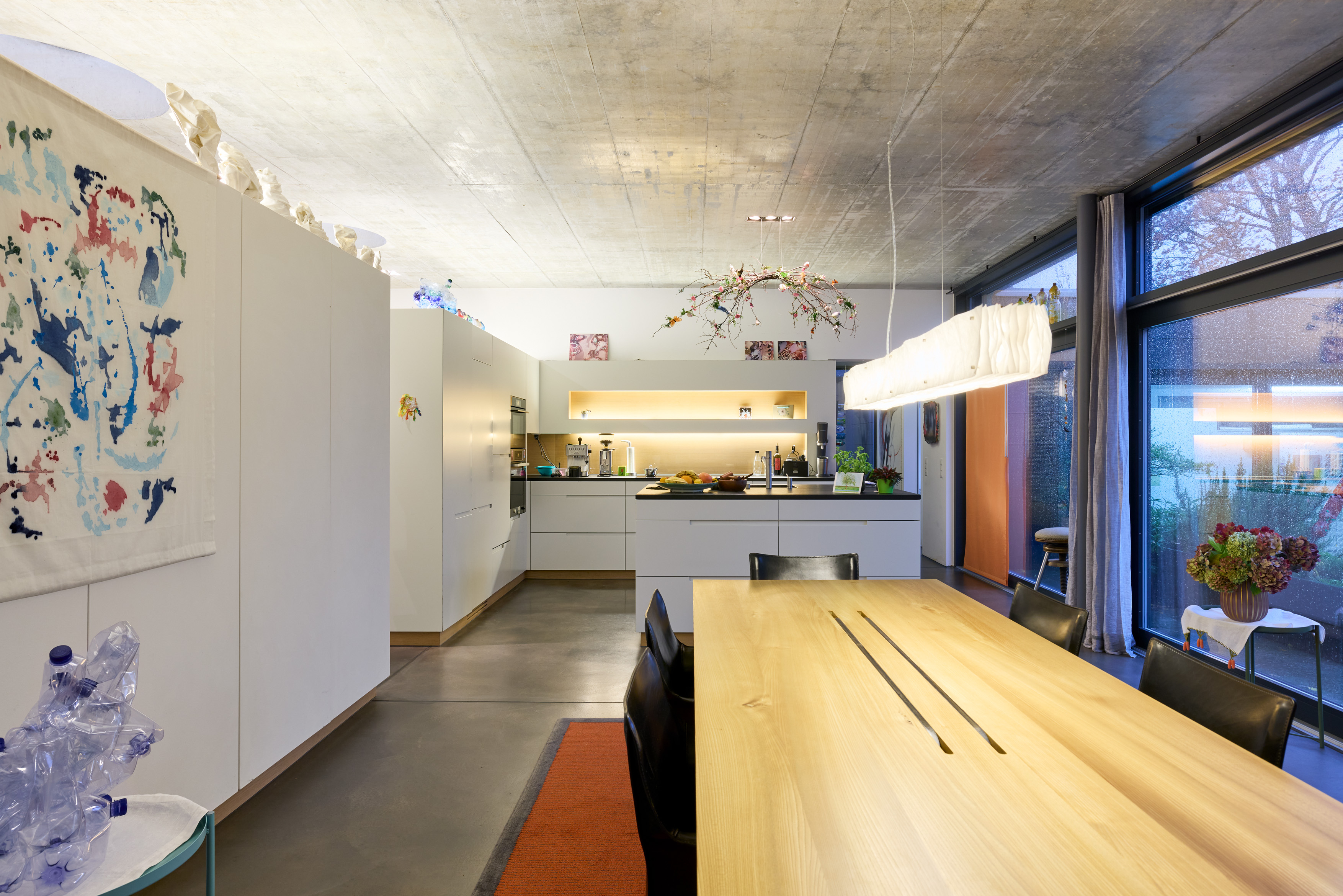 Nach dem Einzug hat es tatsächlich einen Moment gedauert, bis wir uns an den grosszügigen Wohnraum gewöhnt haben. In der Theorie und auf Plänen wirkt vieles abstrakt: die besondere Höhe, die weitläufigen Dimensionen, die Proportionen, der Sichtbeton, die grossen Fensterfronten… Da mussten wir uns ein wenig dran gewöhnen. Zuvor hatten wir ganz anders gewohnt. Nach und nach haben wir den Raum mit Leben gefüllt – jetzt ist es unser Zuhause.