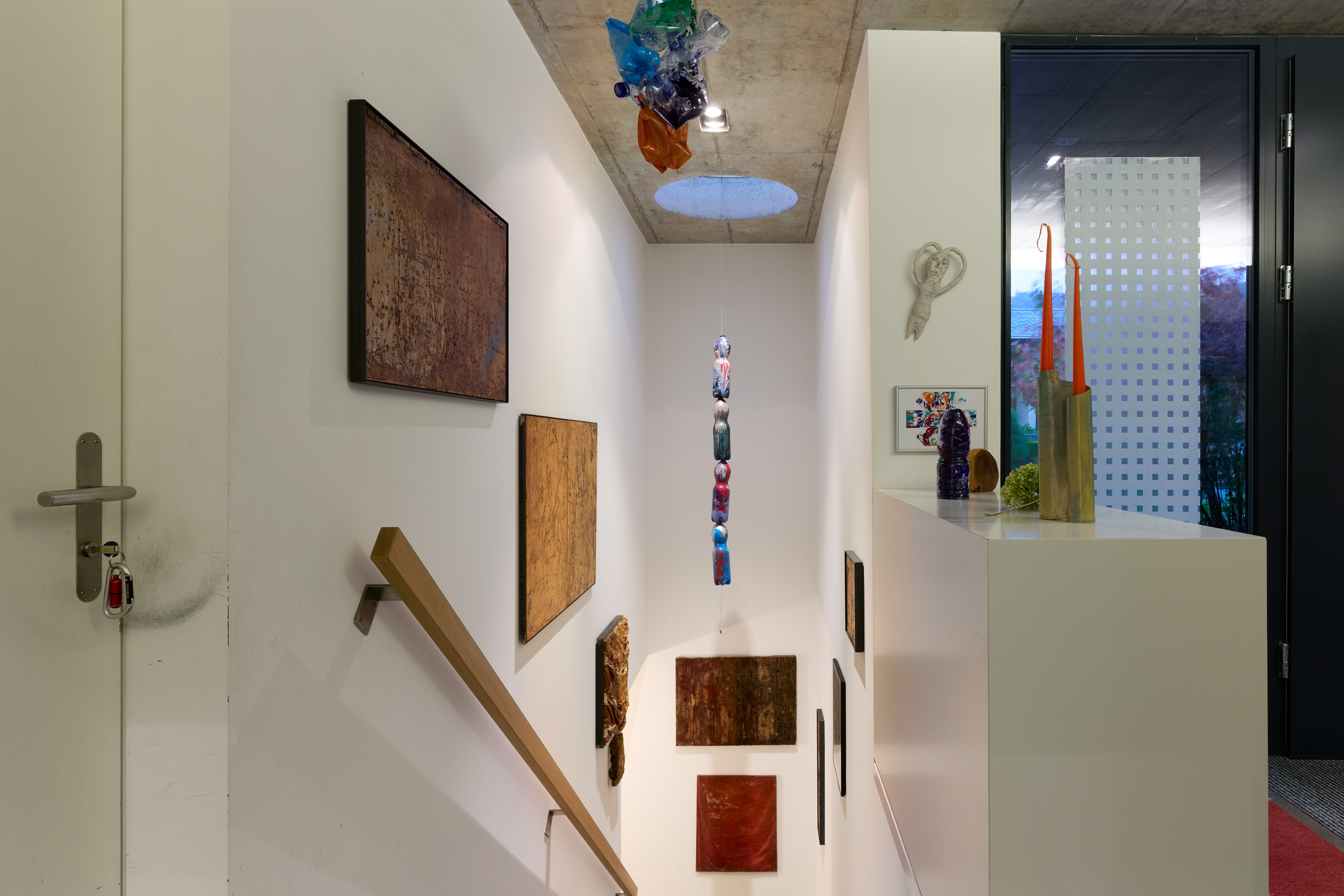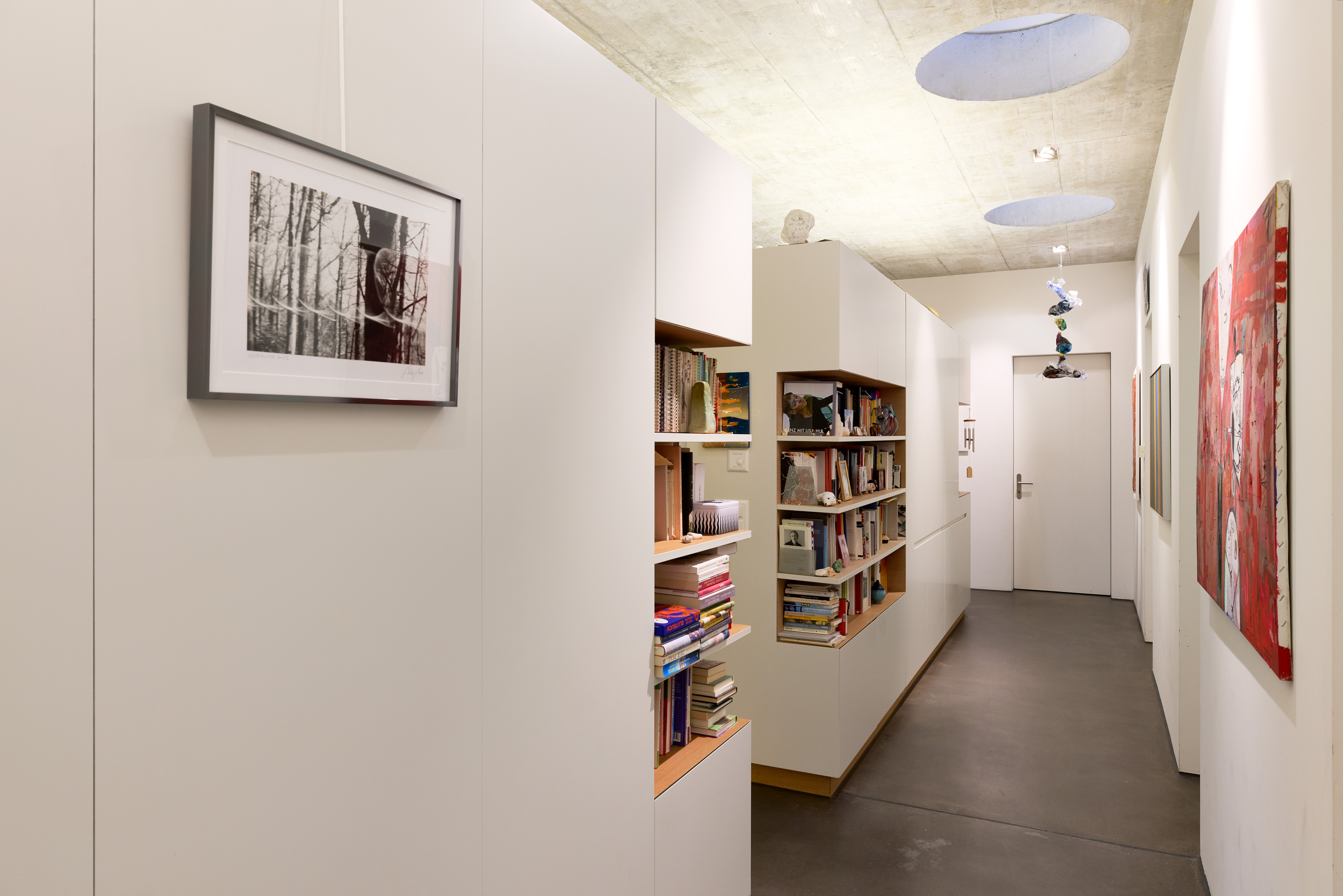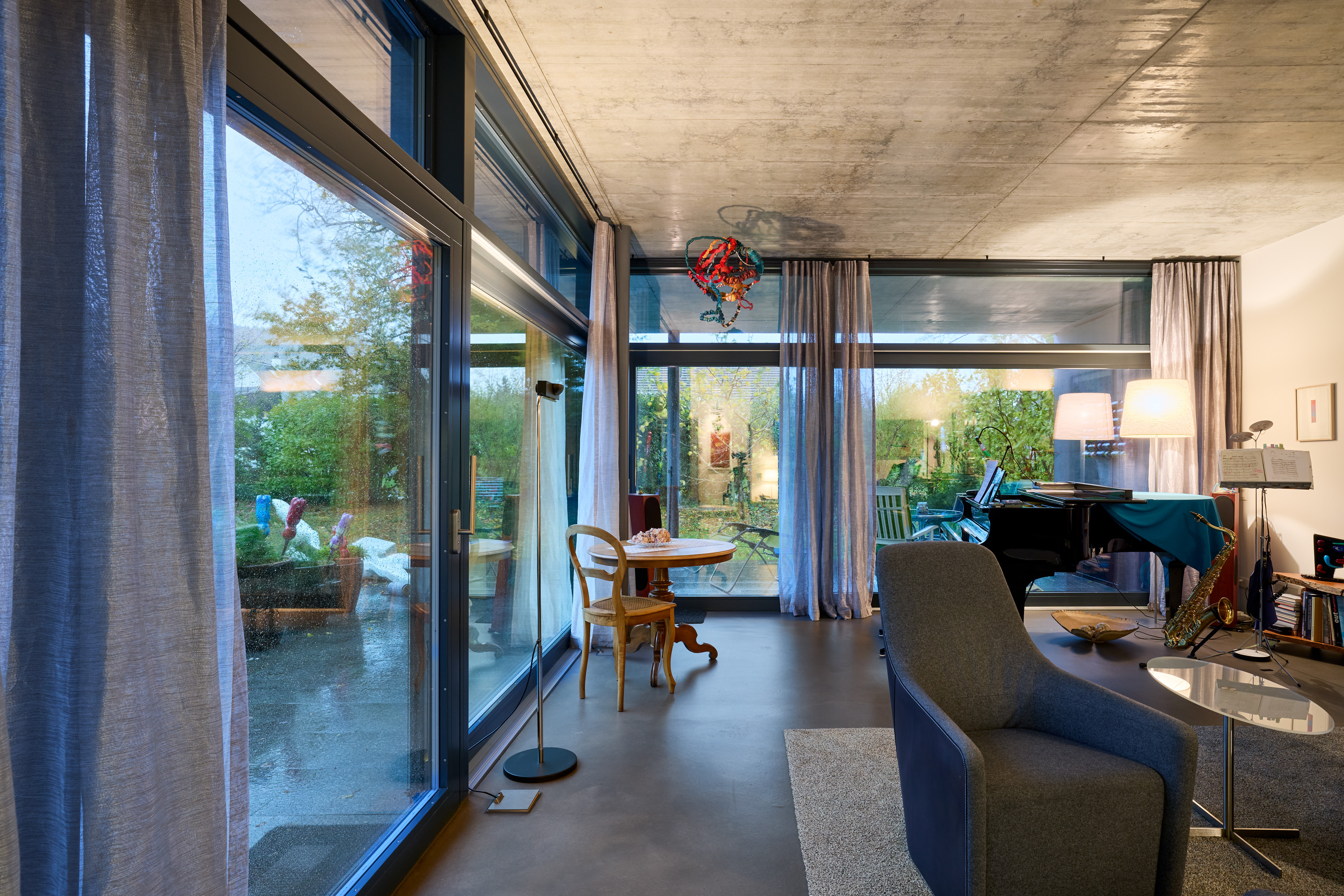 Die Grosszügigkeit haben wir über die Jahre immer mehr schätzen gelernt. Jeder von uns kann seinem Interesse nachgehen, ohne dass man zu nah aufeinandersitzt. Mein Mann musiziert gerne und ich bin vis-à-vis im Atelier. Jeder hat seinen Bereich und trotzdem sind wir zusammen. Dazu der Blick ins ruhige Grüne. Das ist schon wirklich wunderbar. Genau diese Qualität trägt dazu bei, dass wir auch gerne Zeit zu Hause verbringen. Ein weiterer Aspekt, den wir heute mehr denn je schätzen, ist der ebenerdige, eingeschossige Aufbau des Hauses. Gerade mit Blick auf das Älterwerden bietet er klare Vorteile und ermöglicht es, langfristig selbständig im eigenen Zuhause zu bleiben. Die praktische Anbindung an den öffentlichen Nahverkehr ist ebenfalls von Vorteil, weil wir das Auto nicht zwingend brauchen.