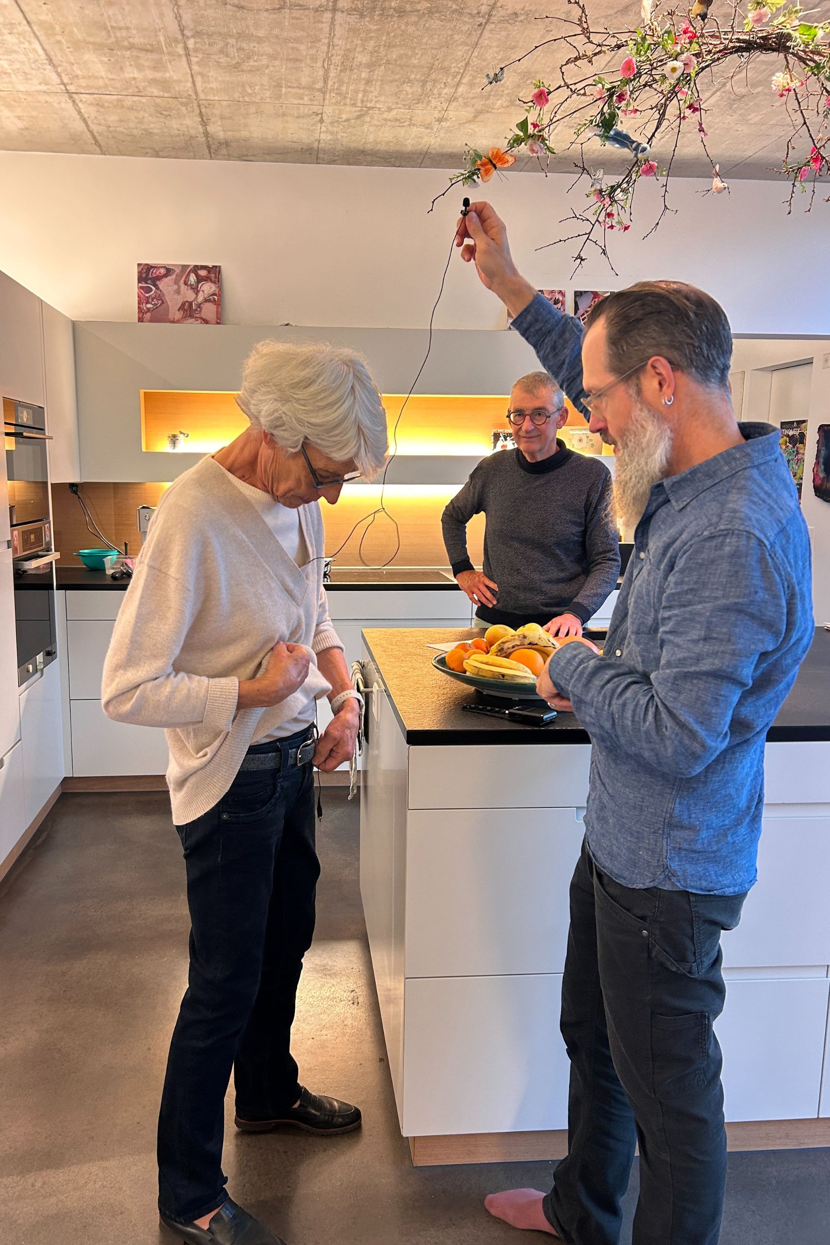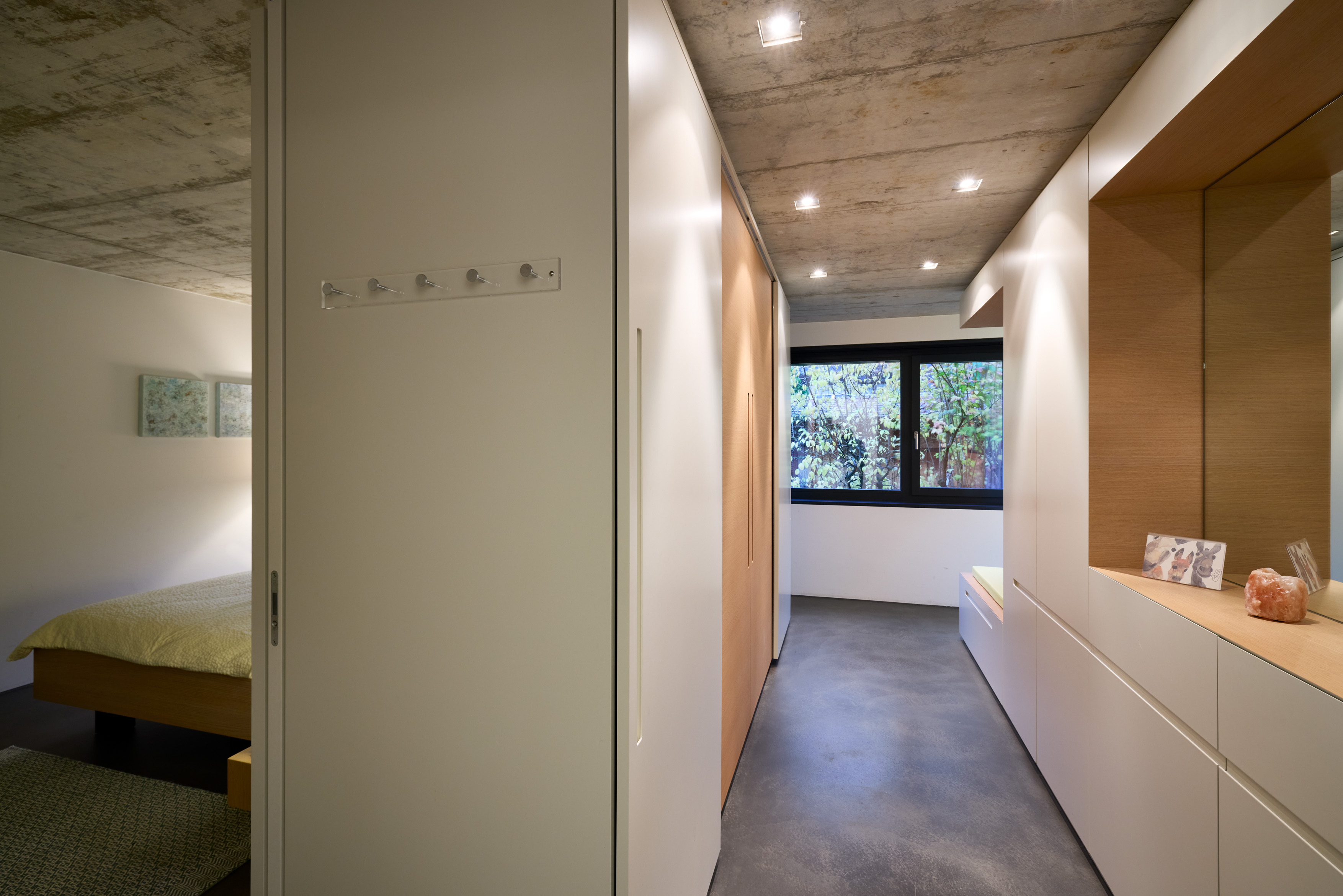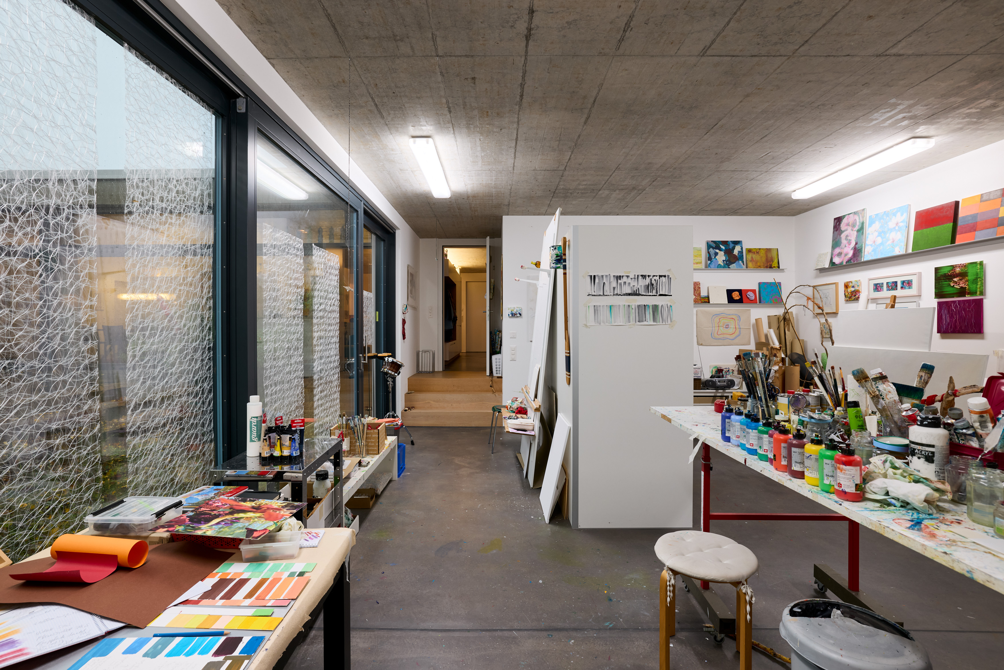 Die Schlafzimmer würden wir heute vermutlich etwas anders planen – wärmere Materialien einsetzen, wie beispielsweise Lehmwände oder einen Holzfussboden. Im Wohn- und Essbereich sorgen Vorhänge und ein Teppich zwar für eine gewisse Schallregulierung. Für uns ist das gut so, aber da man im Alter ja etwas sensibler auf akustische Feinheiten reagiert, würde jemand anderes möglicherweise eine andere Lösung bevorzugen. Wir sind es aber ja nicht anders gewöhnt. Zudem wäre es praktisch, den Atelierbereich noch separater zu haben. Eine flexiblere Nutzung in Form einer möglichen Untervermietung wäre dann einfacher.