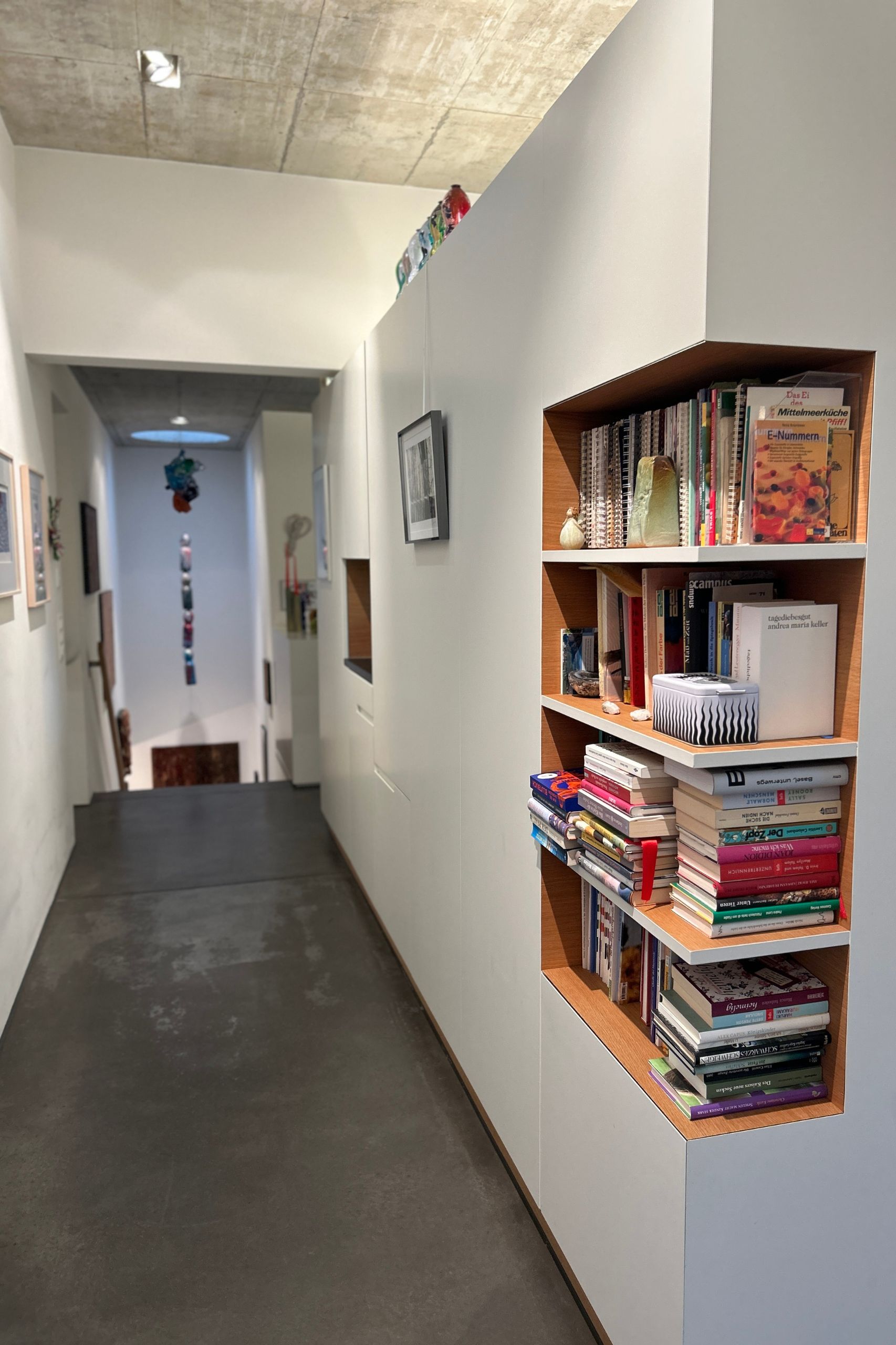Die Architektur des Hauses ist grundsätzlich geradlinig und schnörkellos. Gleiches gilt für den Sichtbeton. Das ist unser Geschmack und gefällt uns nach wie vor sehr. Ausserdem ist der eingefärbte Zementboden mit seiner leicht unregelmässigen Struktur sehr pflegeleicht. Gleichwohl wirkt er – gerade in der dunklen Jahreszeit und ohne Heizung – eher kühl, was sich ein wenig auf das Ambiente auswirkt. Daher, wie schon erwähnt, die Erkenntnis mit dem Holzboden… Insgesamt hätte aus heutiger Sicht ein ausgewogener Mix aus warmen Materialien in Kombination mit der eher kühlen Architektursprache des Hauses sicher auch seinen Reiz.