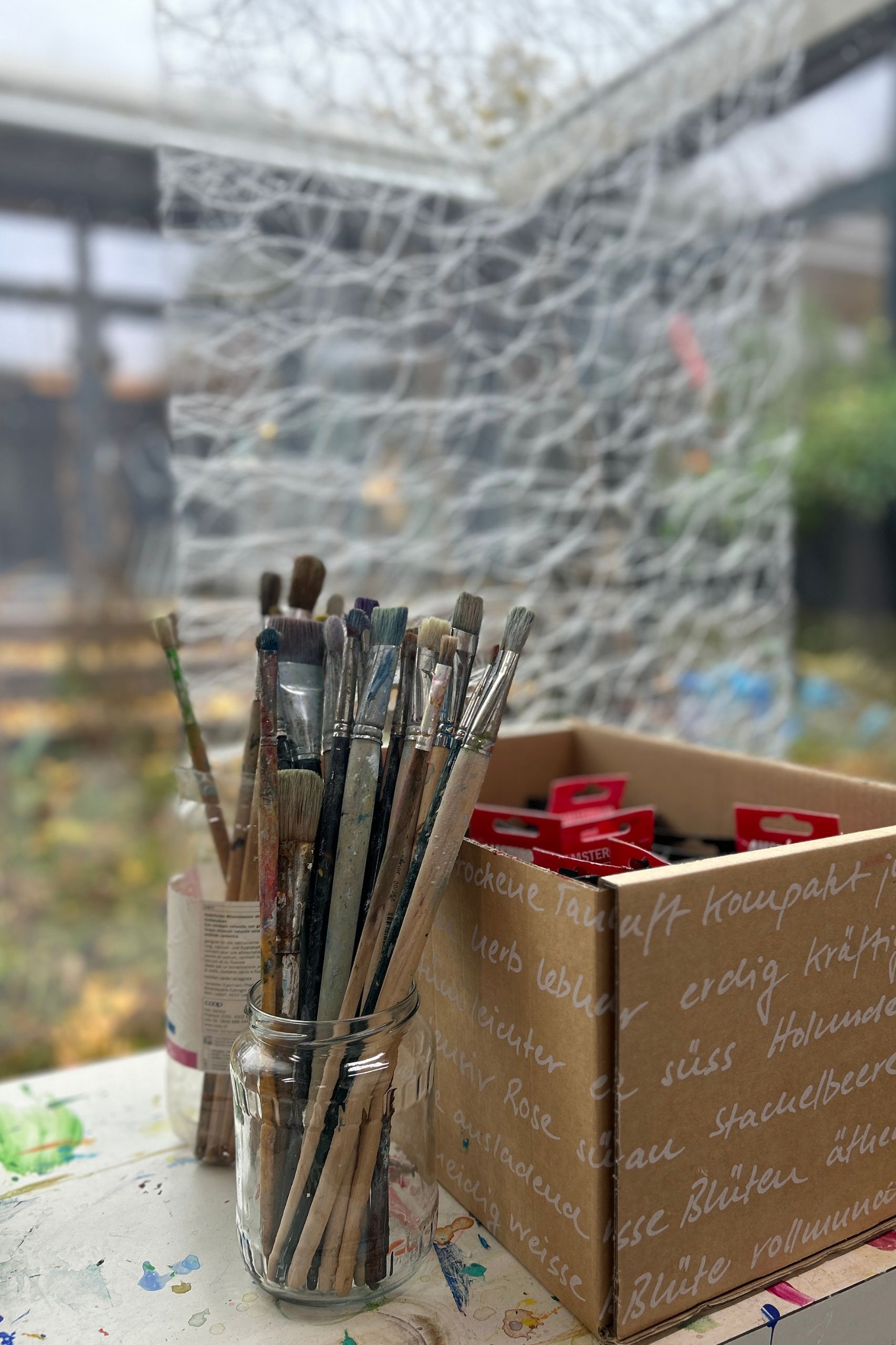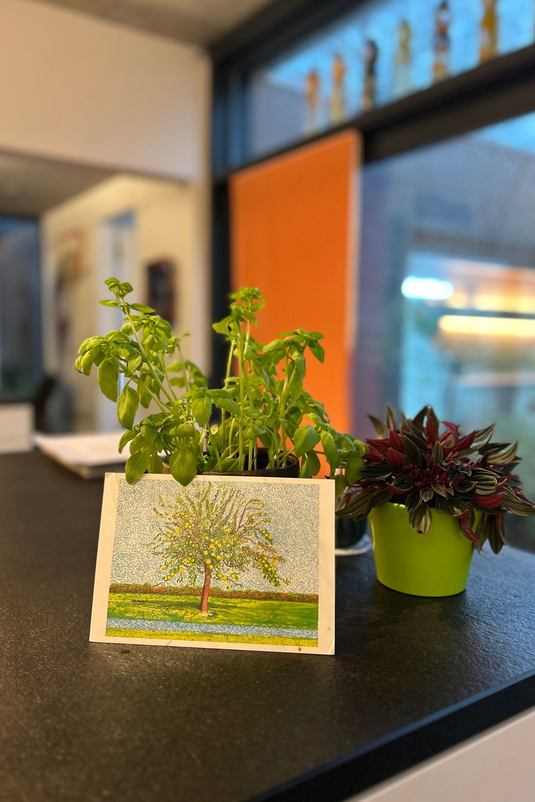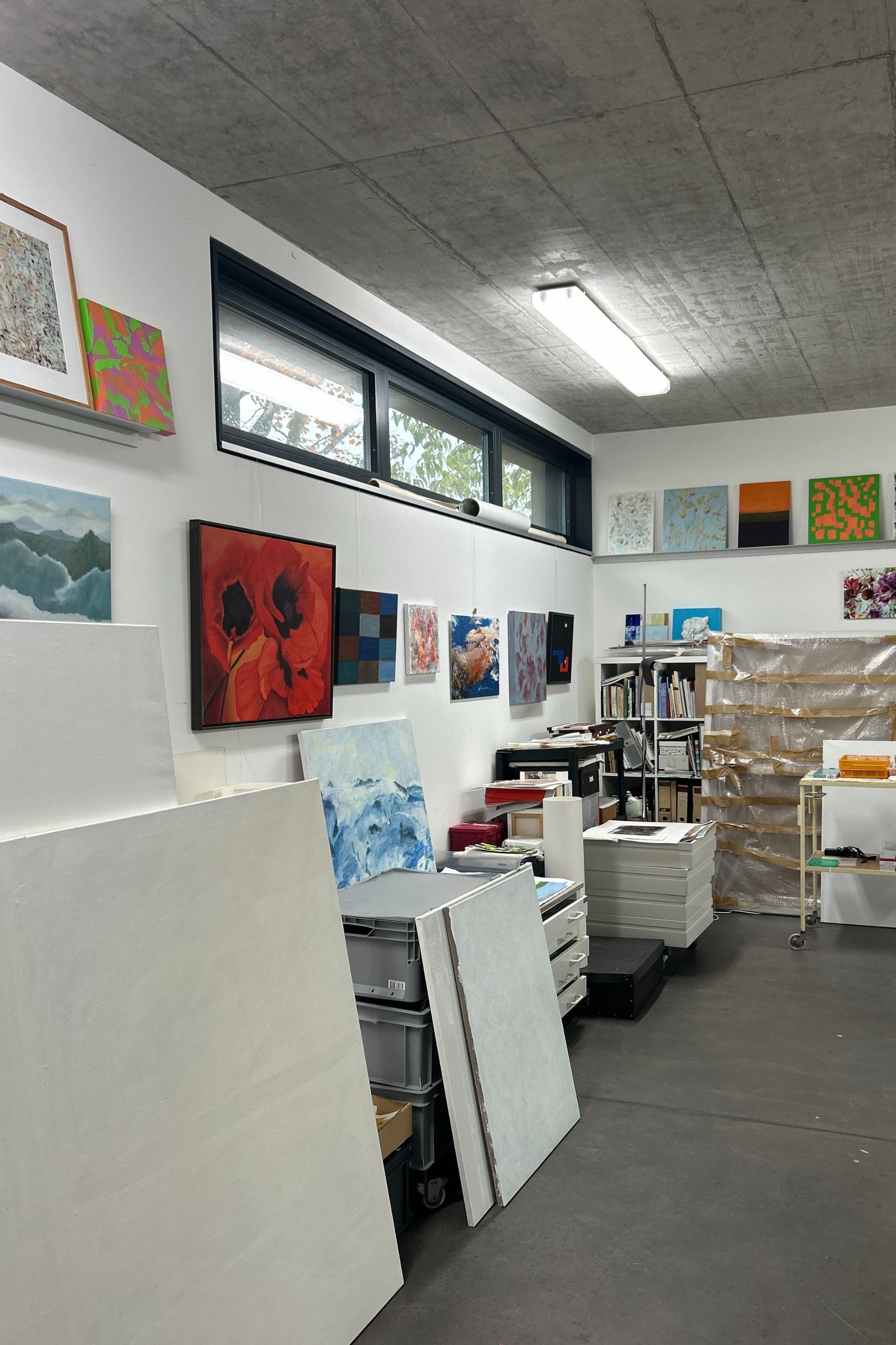 Der Blick vom Atelier über den Garten und die Terrasse rüber zum Wohn-Essbereich und andersherum gefällt uns gut – viel Grün und Natur. Das mögen wir und die Spiegelungen im Glas zeichnen je nach Wetterlage und Tageszeit ein schönes Bild. Gleichwohl sind Garten und Terrasse durch ihre Position im Mittelpunkt, was eine unabhängige Nutzung praktisch unmöglich macht. Was draussen vor sich geht, wird drinnen gesehen. Man ist immer im Blick. Für uns kein Problem. Würde man das Atelier eines Tages aber tatsächlich untervermieten, könnte es zu einem werden, da man immer im Blickfeld der anderen Partei ist.