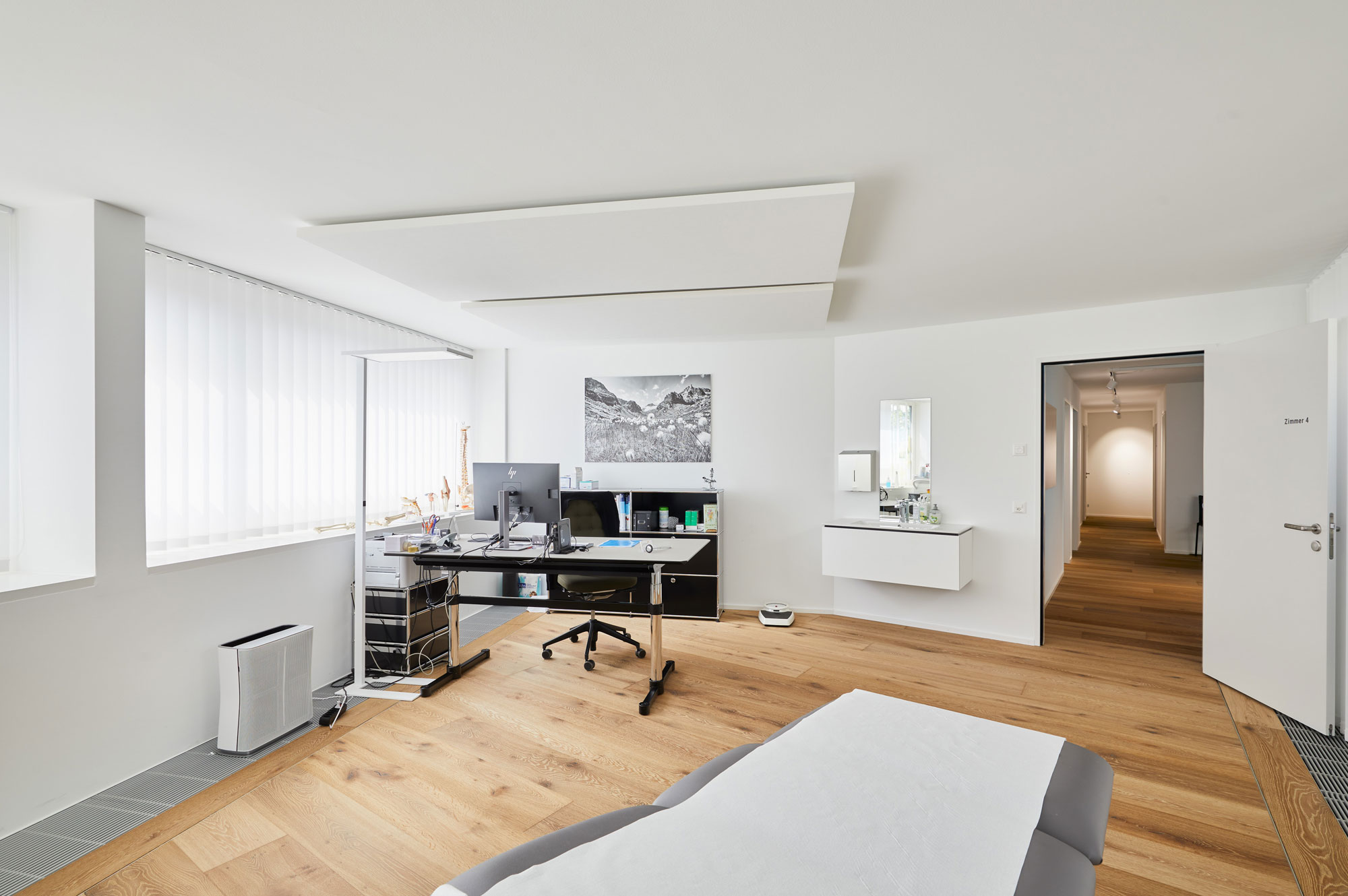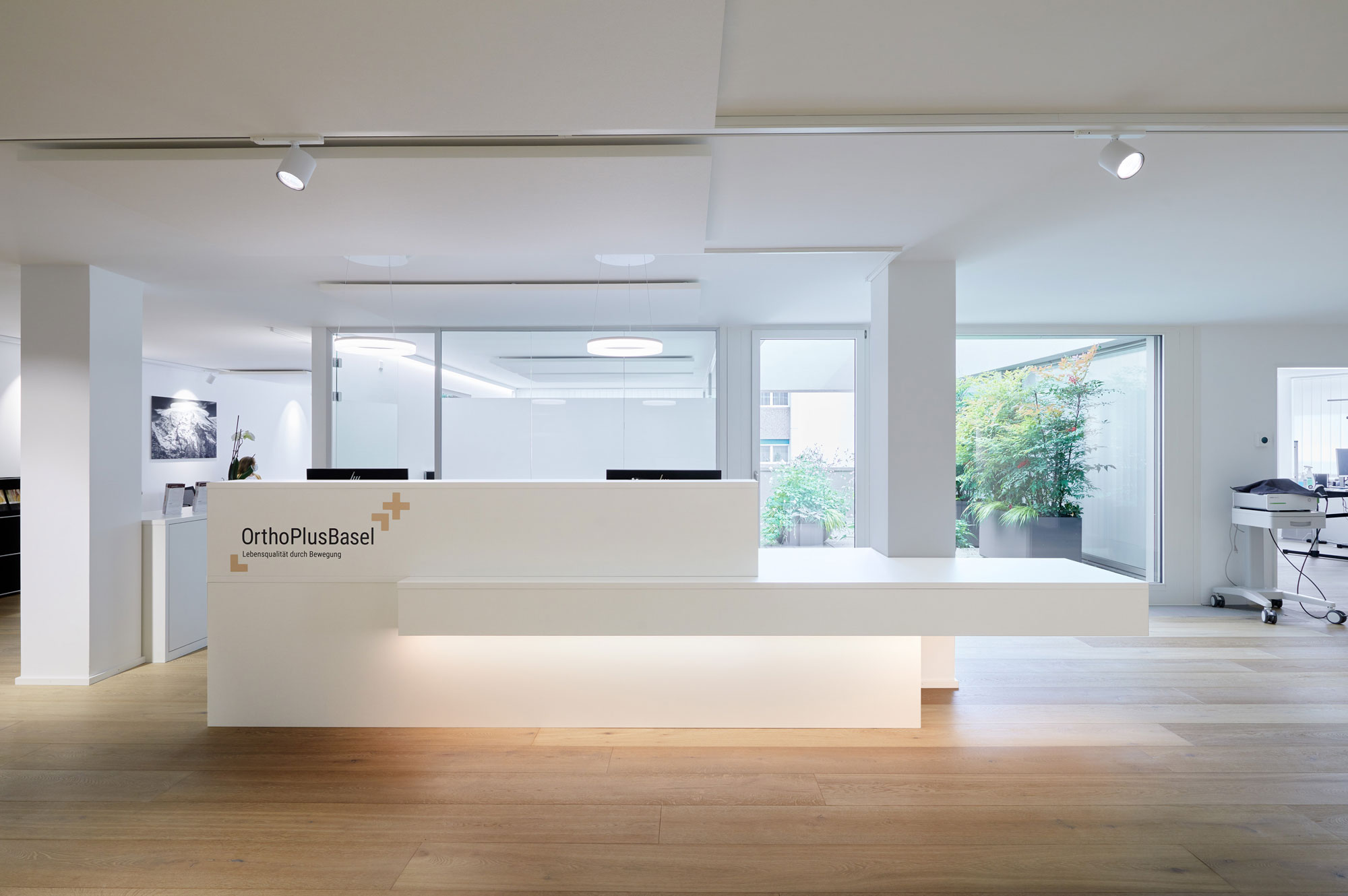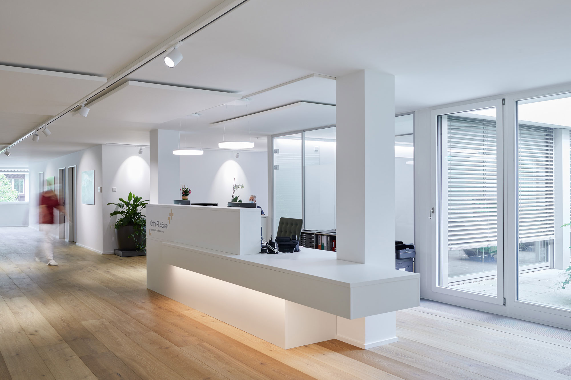 On the second floor of a newly renovated commercial building in Binningen, the orthopaedic practice OrthoPlusBasel was built on a vacant total area of 430 m2. In addition to the reception/waiting area and the treatment rooms, the practice also has a laboratory, an X-ray room, a kitchen and a loggia for the practice team.