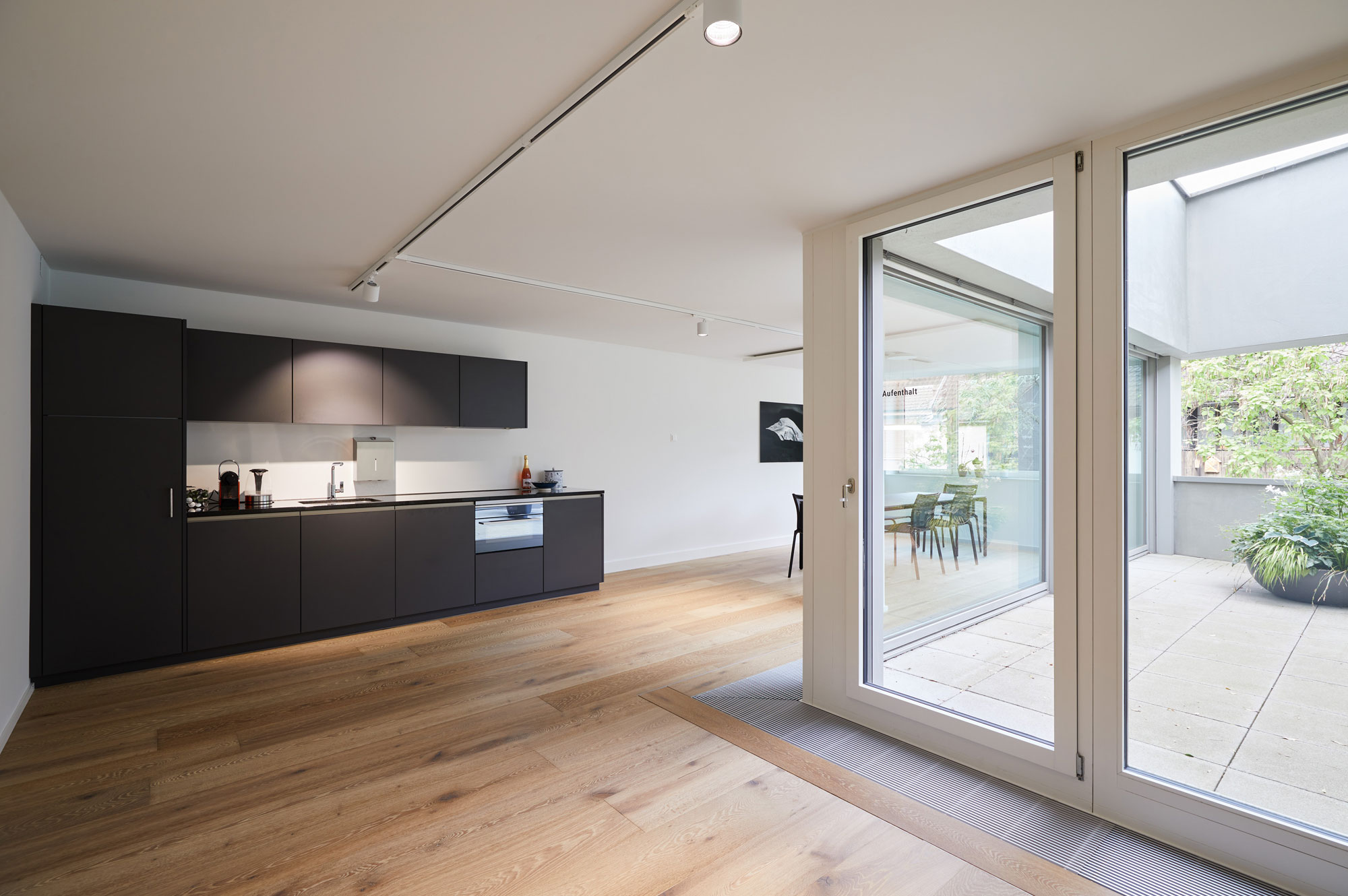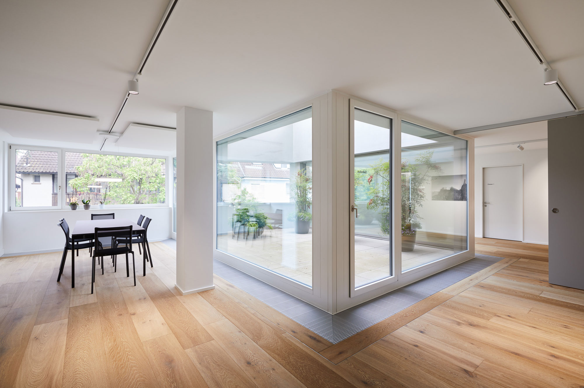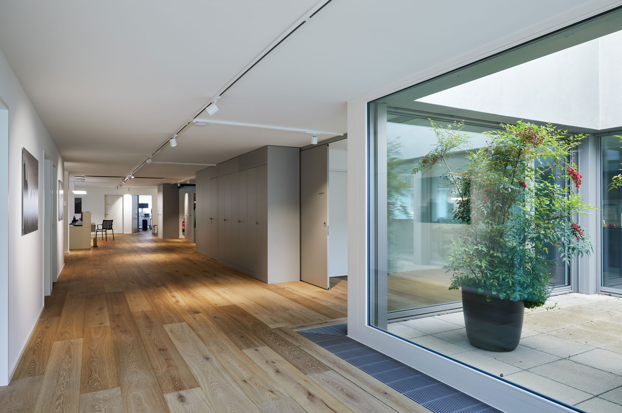 On the second floor of a newly renovated commercial building in Binningen, the orthopaedic practice OrthoPlusBasel was built on a vacant total area of 430 m2. In addition to the reception/waiting area and the treatment rooms, the practice also has a laboratory, an X-ray room, a kitchen and a loggia for the practice team.